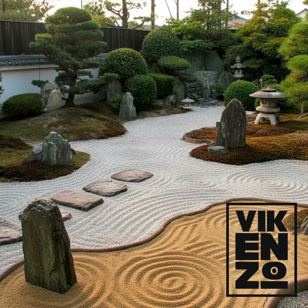 Los jardines Zen están formados por diferentes elementos naturales (eminentemente arena fina, piedras pulimentadas, más tarde se les agrega figuras de piedra, madera, estancos de agua, y bonsáis o bien arboles afines de forma sabia puestos con la intención de completar el espacio creado de paz y armonía. Son jardines sin flora o bien paisajes secos (kare-sansui) en los que la arena cubre toda la superficie del jardín tal y como si fuera un mar en calma.
